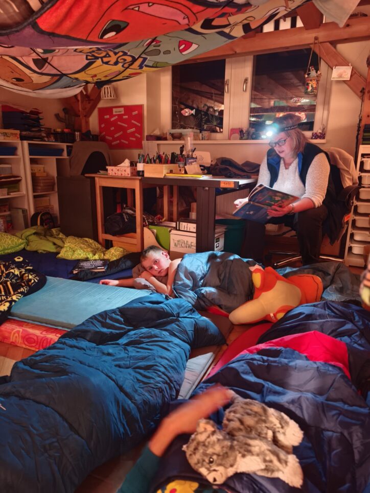 Die Dani-Klasse der SCHKOLA Oberland erlebte am 23. Oktober 2025 eine fröhliche Lesenacht mit Spiel, Spaß und Geschichten. Nach einem bewegten Start in der Turnhalle mit Hüpfburg und Musik wurde gelesen, gebastelt und gelacht. Besonders beliebt waren Detektivgeschichten, die Olchies und das Kürbisbasteln. Zum Abendbrot gab es Burger, Hotdogs und Nachtisch. Ein herzliches Dankeschön geht an alle Eltern, die mitgeholfen und den Abend zu einem tollen Erlebnis gemacht haben.