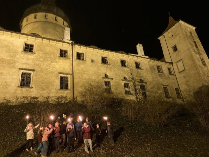 Anschließend folgte ein Rundgang mit Fackeln um die Burg. Im Schein der flackernden Flammen wirkte Grabštejn geheimnisvoll und märchenhaft – ein echtes Highlight für alle Beteiligten.